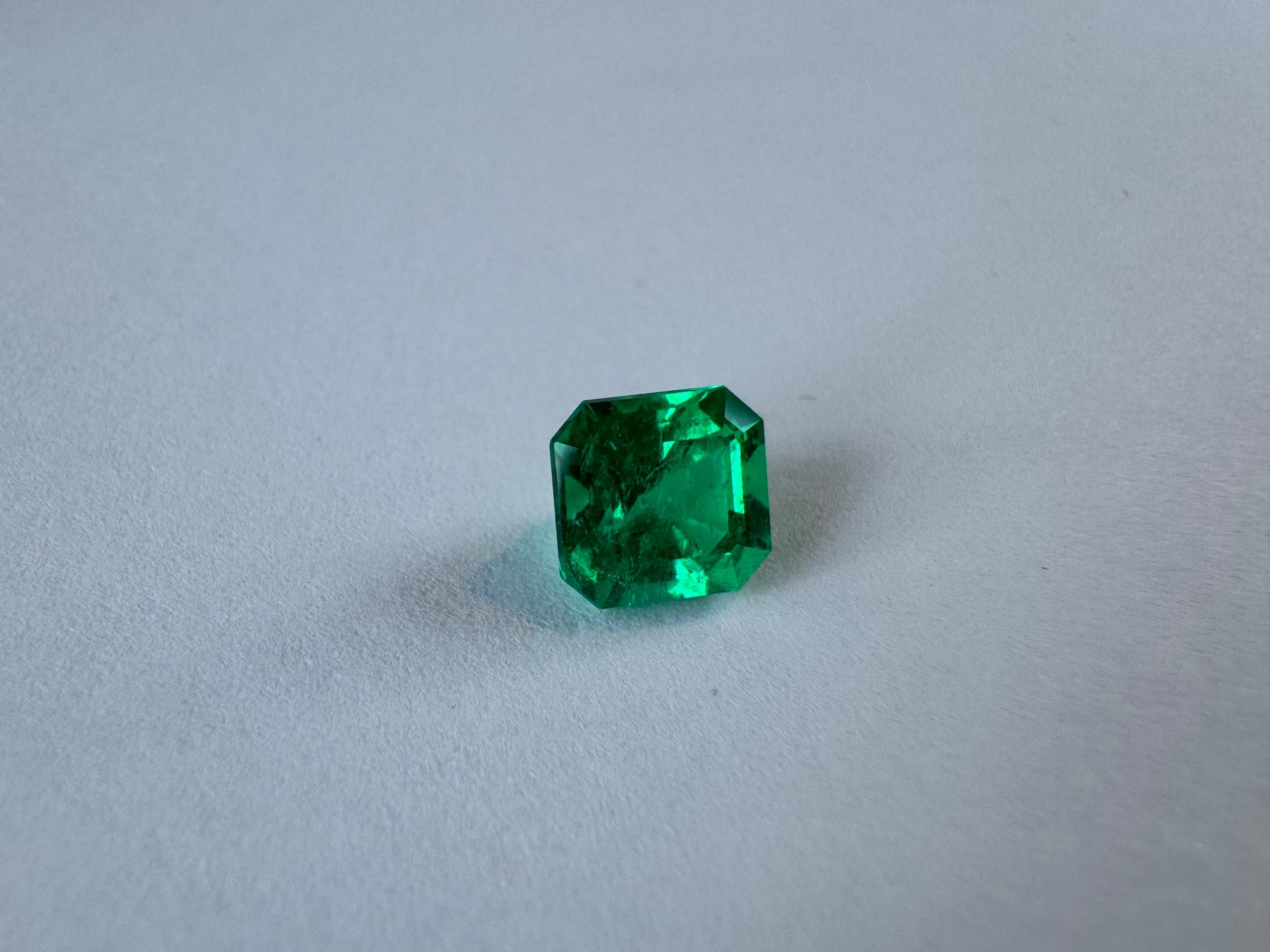 Avec un poids précis de 7.40 carats, cette pierre arbore une taille rectangulaire classique, qui met en valeur l’intensité de son vert profond et captivant. Sa transparence et son éclat exceptionnel qui en font une pièce idéale pour un bijou de grand valeur.